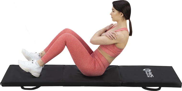De tre solide paneler foldes ud og sammen på få sekunder. Integrerede håndtag gør det nemt at bære den til gymnastiksalen og på farten.