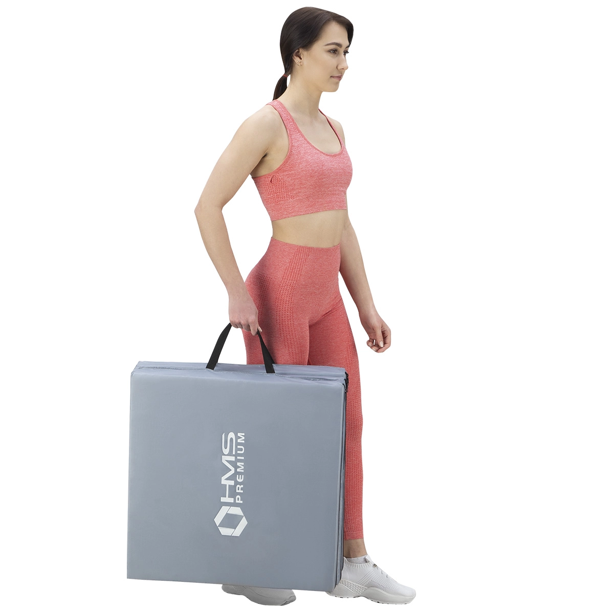 Takket være den sammenklappelige konstruktion med tre faste paneler kan måtten foldes ud og sammen på få sekunder. Når den er foldet, får den en kompakt form, der sparer plads i lejligheden, træningssalen eller bagagerummet. Integrerede håndtag gør den nem at bære, så du kan træne hvor som helst.