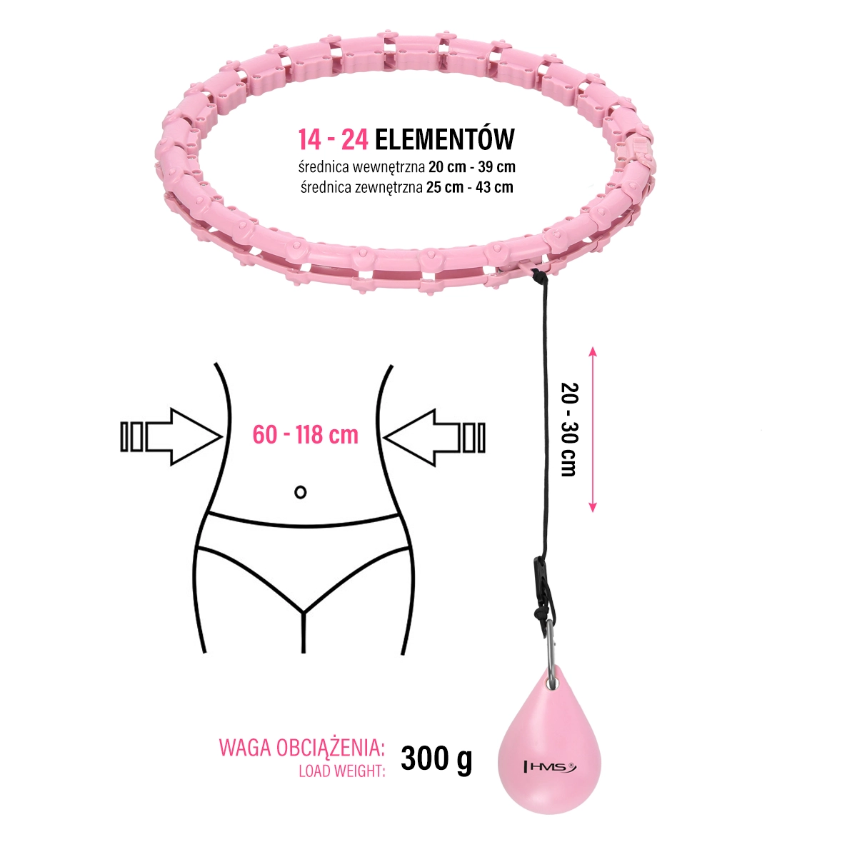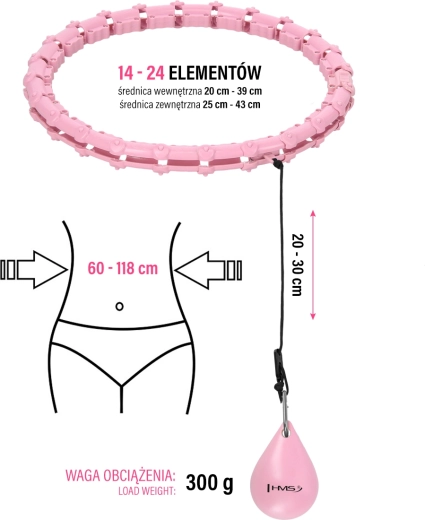 HMS HHW02 er en moderne hula hoop-bøjle med justerbar længde og en roterende vægt på 300 g, som øger træningsintensiteten. Den sammenklappelige konstruktion af 24 segmenter gør det nemt at tilpasse taljeomkredsen (60–118 cm). De indvendige massageflader stimulerer behageligt mave- og taljeområdet, mens den jævne bevægelse mindsker belastningen på ryg og hofter.