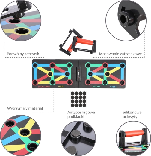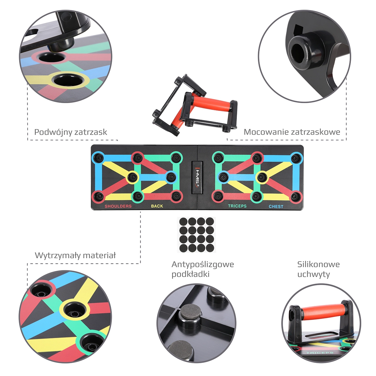 HMS PU12 er et smart, sammenklappeligt armbøjningsbræt med 8 par huller og farvemarkering til præcis håndplacering. Forskellige grebsvinkler aktiverer specifikke muskelgrupper: grøn for triceps, gul for ryg, rød for skuldre og bryst, blå for forskellige varianter af brystmuskler. Skridsikre håndtag og en solid base af plast sikrer tryghed i hver gentagelse.