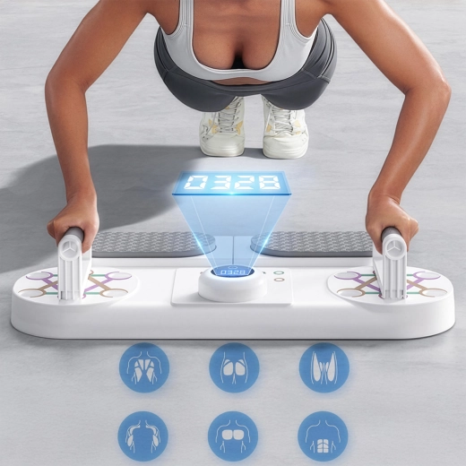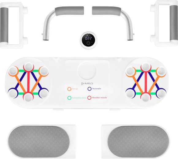 Kompakt og alsidigt redskab til hjemmetræning af overkrop og core. HMS DBP03-pladen kombinerer en stabil base til planke, justerbare håndtag til armbøjninger og en smart tæller med optisk (IR) sensor, som automatisk tæller gentagelser. Takket være farvemarkerede greb kan du nemt målrette bryst, skuldre, triceps og ryg, mens skridsikker tekstur samt skumhåndtag og albuepuder sikrer komfort og sikkerhed.