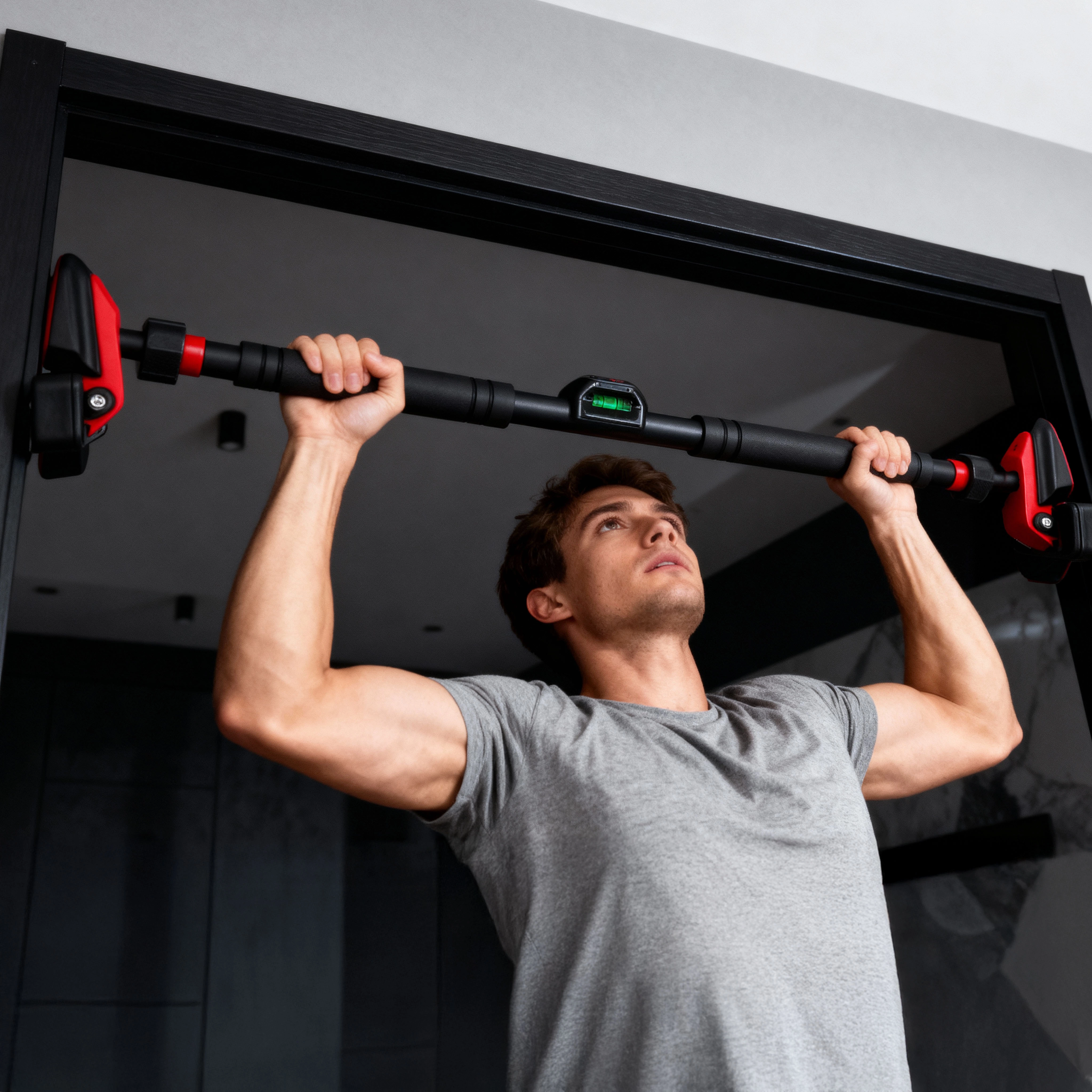 Robust teleskopisk flerlaget stål sikrer bæreevne op til 210 kg, mens en sikkerhedslås af typen mortise & tenon forhindrer utilsigtet løsning. Bløde skridsikre anlægsflader med trezonet tekstur beskytter karmen og holder stangen solidt på plads. Montering foregår helt uden boring, og korrekt placering lettes af det integrerede vaterpas. Skumgreb er komfortable og holdbare selv under længere træning.