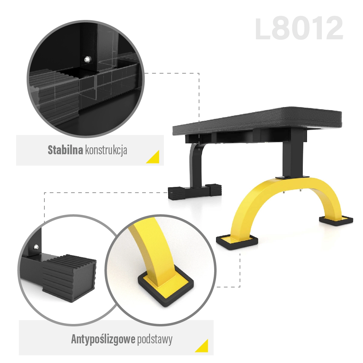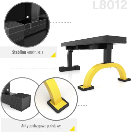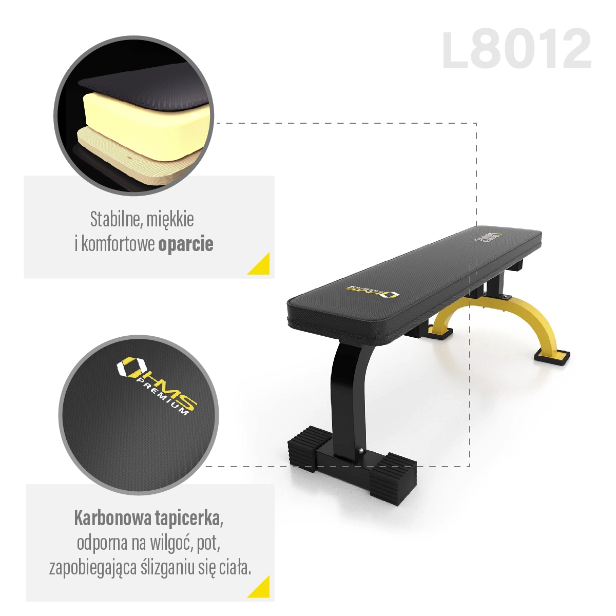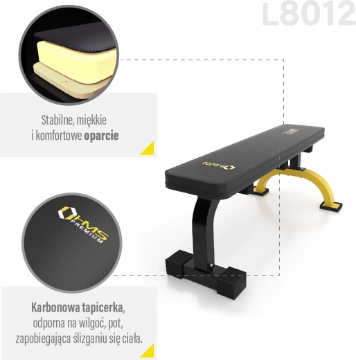 Den flade bænk HMS Premium L8012 er en alsidig bænk til hjemmetræning, velegnet til øvelser med håndvægte, vægtstænger og egen kropsvægt. Den tilbyder en robust konstruktion med maksimal belastning på 200 kg, behagelig, kraftig polstring og en udvidet stabilisator for maksimal stabilitet selv ved tunge sæt.