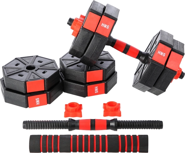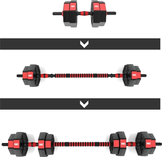 HMS SGC15-sættet er en komplet løsning til hjemmetræning: to håndvægte kan ved hjælp af forbindelsesdelen hurtigt laves om til en lang vægtstang. Holdbare PVC-skiver fyldt med cement og gevindstænger med stjernelåse sikrer stabil belastning under øvelserne. Den sekskantede form forhindrer desuden, at skiverne ruller.
