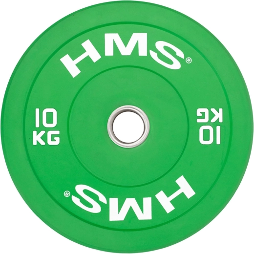 Holdbar farvet bumper-skive HMS 10 kg til vægtløftning og funktionel træning. Standarddiameter 450 mm, hul 50/51 mm til olympiske stænger og gummikonstruktion for mindre tilbagespring og gulvbeskyttelse. Tydelig vægtangivelse og centerbøsning i rustfrit stål beskytter stangen mod ridser.