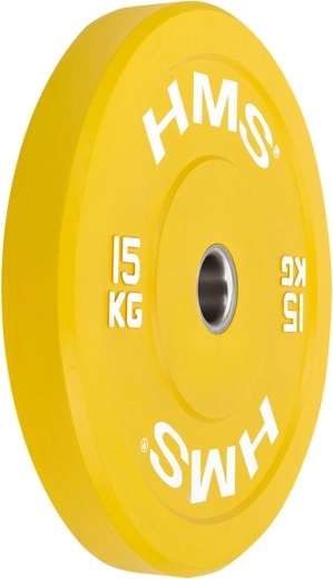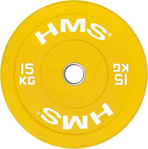 Professionel farvet bumper-skive fra HMS på 15 kg til vægtløftning og funktionel træning. Takket være modstandsdygtig gummi og en rustfri centerbøsning beskytter den både gulv og stang, dæmper støj ved drops og er fuldt kompatibel med olympiske 50 mm-stænger. Den gule farve svarer til konkurrencemærkning for nem orientering under træning.