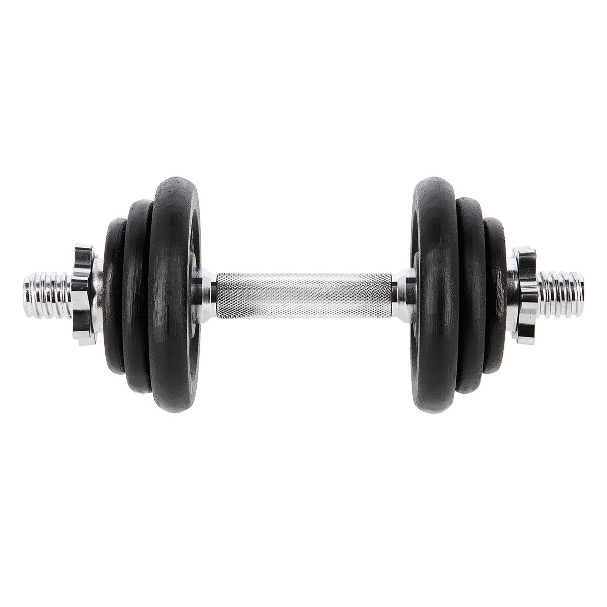 Håndvægten er ideel til biceps curls, pres, triceps og skulderøvelser. Den gevindskårne stang på 35 cm med en diameter på 30 mm gør det nemt at ændre vægtkombinationer og tilpasse modstanden til dine mål. Stjernemøtrikker (spin-lock) med gummiring holder skiverne sikkert på plads og forhindrer, at de løsner sig under træningen.