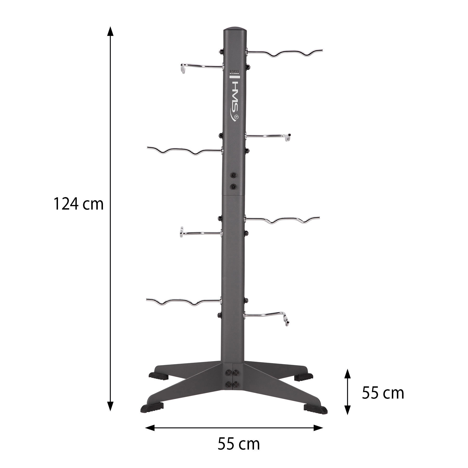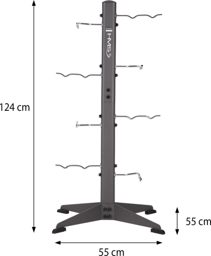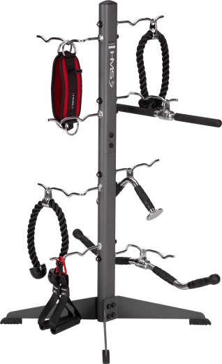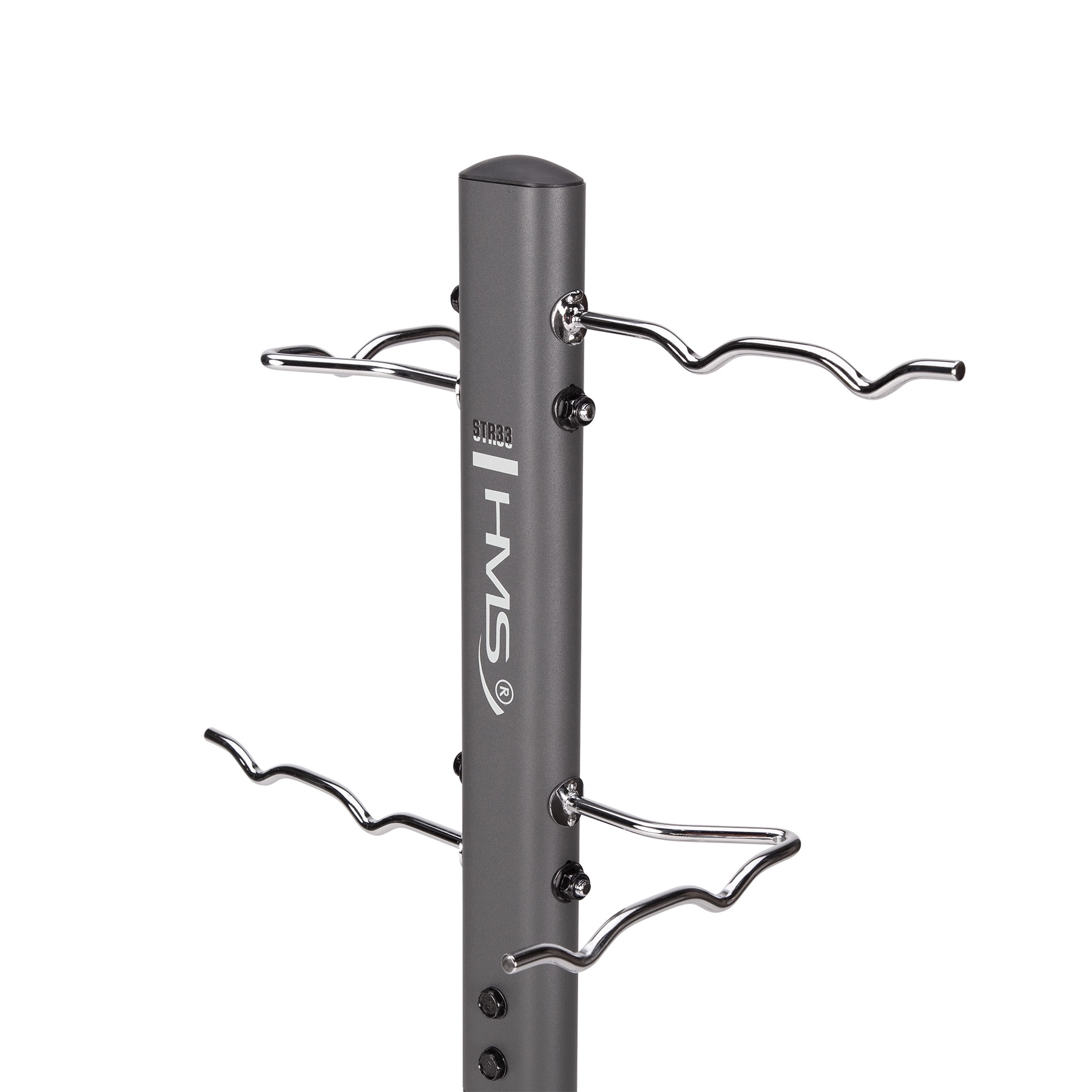 Tilbehørsstativet HMS STR33 er en smart løsning til organisering af fitnessudstyr. Den robuste stålkonstruktion med bred base giver høj stabilitet, mens otte kroge med en bæreevne på op til 30 kg pr. stk. kan bære flere tilbehørsdele samtidig. Takket være de gennemtænkte krogformer hænger udstyret sikkert og er altid let tilgængeligt.