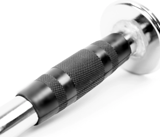 Teksturerede gummihåndtag minimerer glid og giver komfort selv under tunge sæt.