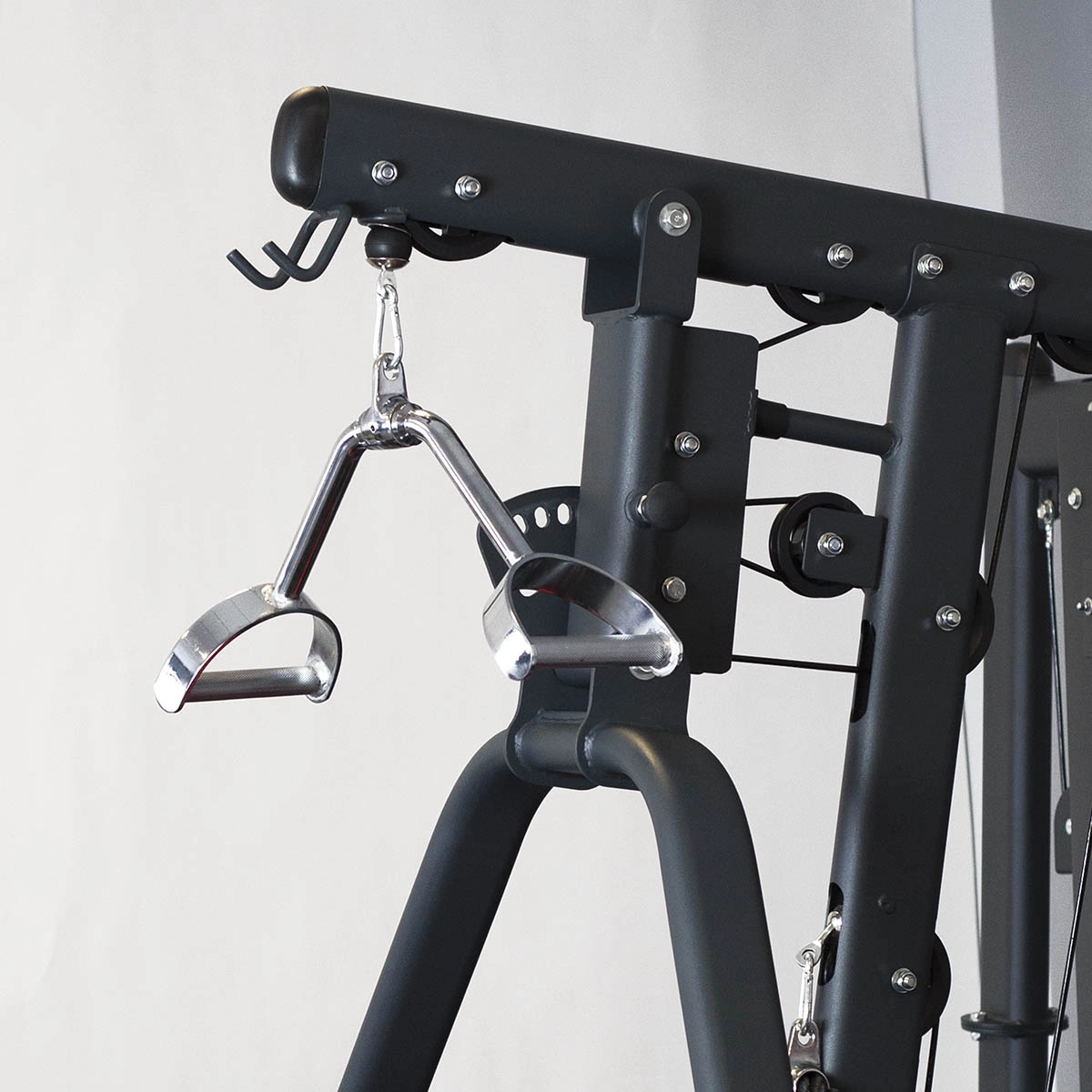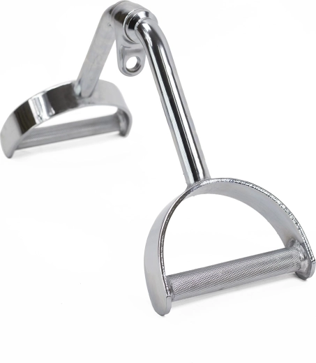 Den fuldmetal-konstruktion med skridsikker rifling på håndtagene giver fremragende kontrol selv ved højere belastninger. Det universelle øje til fastgørelse er kompatibelt med almindelige kabelsystemer, så adapteren nemt kan integreres i både hjemme- og kommercielle fitnesscentre.
