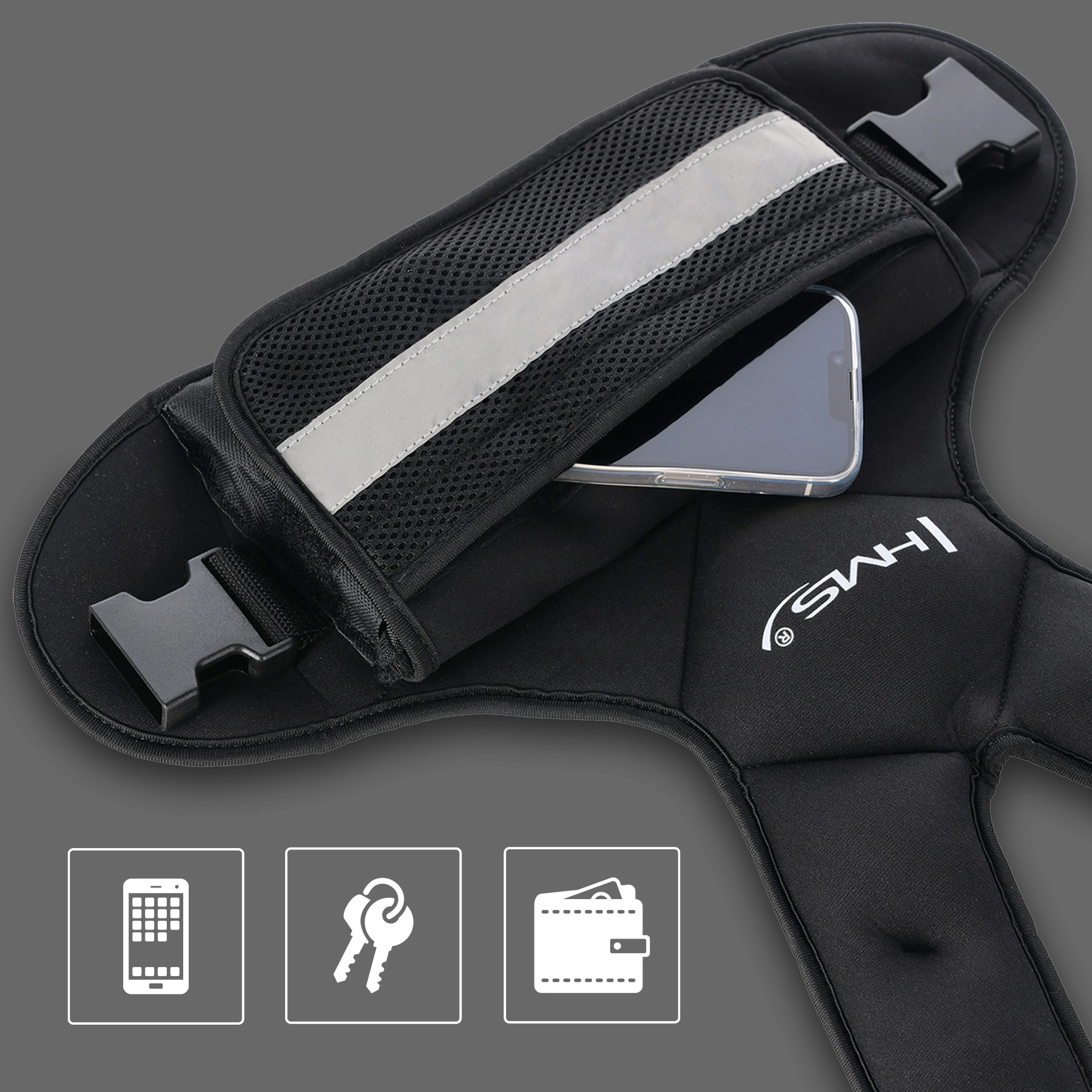 Det bløde neoprenmateriale er svedafvisende og hjælper vesten med at blive siddende, selv ved intens bevægelse. Justerbare sidestropper sikrer en sikker og individuel pasform. En praktisk netlomme rummer telefon eller nøgler, og reflekterende elementer øger sikkerheden ved udendørstræning i dårligere sigtbarhed.