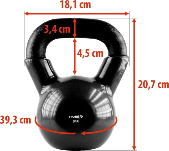 HMS kettlebell 8 kg er et pålideligt valg for både begyndere og øvede. Det solide støbejernskorpus med vinylbelægning beskytter gulve, reducerer støj og er let at vedligeholde. Det ergonomiske, brede greb muliggør sikker håndtering med én eller begge hænder, mens den flade bund sikrer stabilitet ved afsætning og forberedelse til næste sæt.