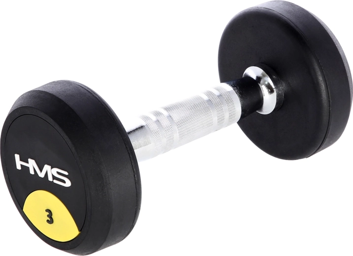 Håndvægten HMS HG Pro 3 kg kombinerer en kerne af støbejern med en kraftig gummibelægning, som beskytter både udstyr og gulv, samtidig med at den dæmper støj. Det metalhåndtag i forkromet stål har en tøndeform og markant rifling, hvilket sikrer et fast og behageligt greb selv under længere sæt.