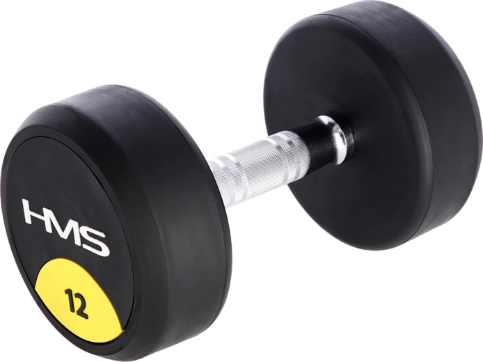 Håndvægten 12 kg HMS HG Pro er designet til intensiv styrketræning. Hovedet af støbejern er beskyttet af et tykt lag gummi, som dæmper stød, reducerer støj og beskytter både gulv og selve håndvægten. Det ergonomiske, tøndeformede håndtag i krombelagt stål med markant rifling giver et sikkert og behageligt greb selv under hårde sæt.
