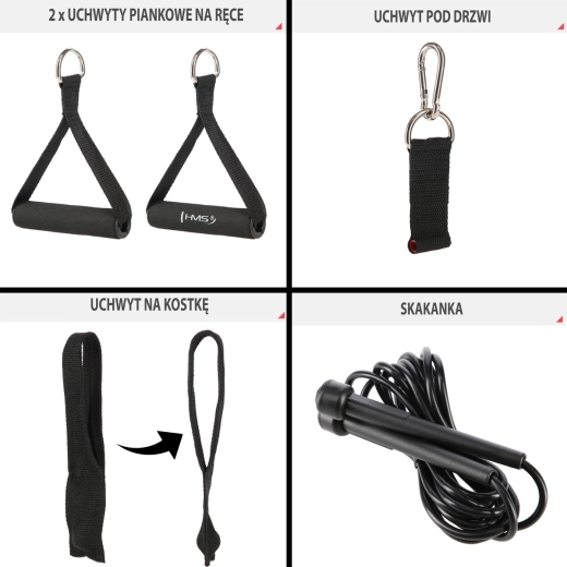 Sættet HMS TX02 er en moderne løsning til funktionel helkropstræning. Det kombinerer forskellige typer modstandsbånd, greb og en døranker-adapter, som forvandler en almindelig dør til en hjemme-”trækstation”. Fem justerbare modstandsniveauer gør det muligt præcist at tilpasse intensiteten til både begyndere og øvede og gradvist øge sværhedsgraden.