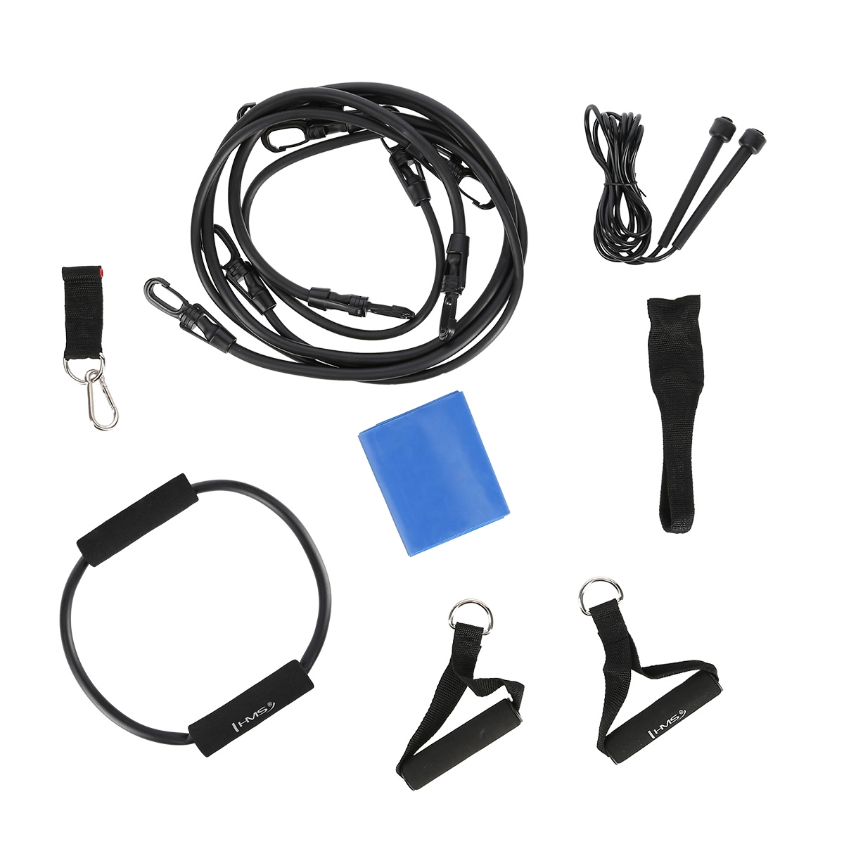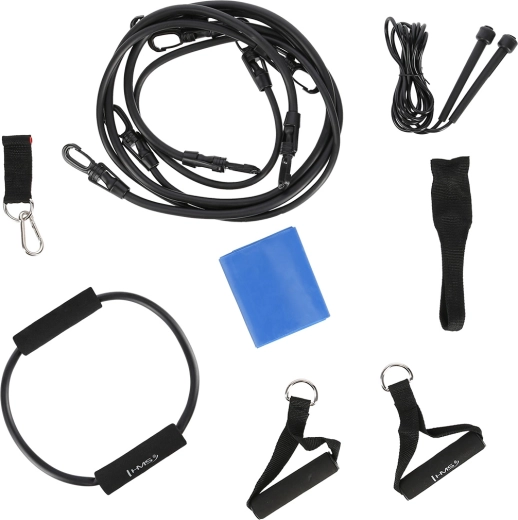 - 4 ekspandere med forskellig modstand; træningselastik; træningsslynge; 2 skumhåndtag; ankelstrop; døranker-adapter; sjippetov; opbevaringspose