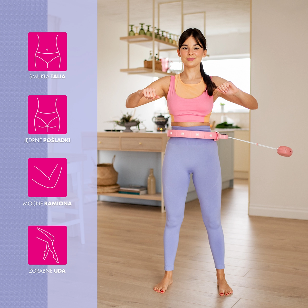 I modsætning til en klassisk hulahopring falder bøjlen ikke ned, den bliver sikkert på plads, og vægten i snoren skaber centrifugal modstand for mere intens træning. Regelmæssig brug hjælper med at slanke taljen, forme mave, lår og balder og forbedre konditionen. Overfladen af kvalitets-PVC og ABS sikrer holdbarhed og lang levetid.