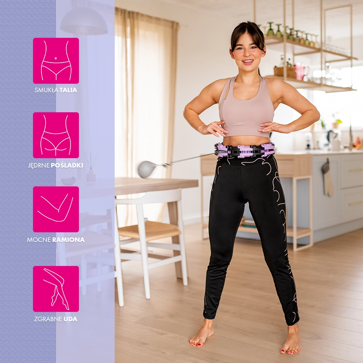 I et af ringens segmenter findes et tæller-display, der registrerer antallet af rotationer, så du har overblik over din træning. Regelmæssig brug hjælper med at slanke mave og talje, opstramme lår og baller samt forbedre konditionen. Ringen er fremstillet af holdbare materialer: PVC og ABS for lang levetid.