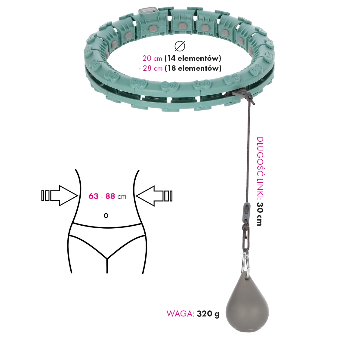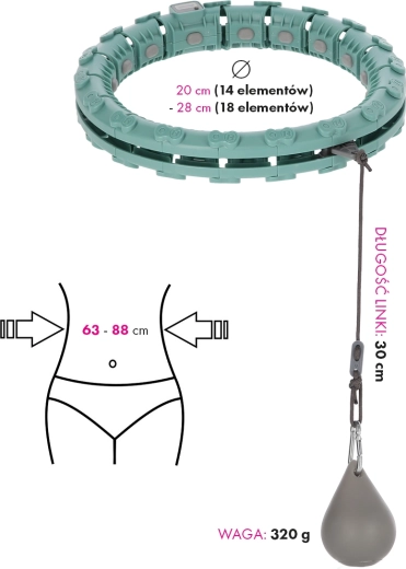 Det smarte massage-hulahop består af modulære led, som du nemt klikker sammen efter din taljeomkreds. De indvendige massageknopper stimulerer behageligt mave- og hofteområdet og dæmper samtidig vibrationer. Med den roterende vægt på lejer får du en glidende bevægelse og højere træningsudbytte, som du selv styrer med cirkelhastighed og snorens længde.