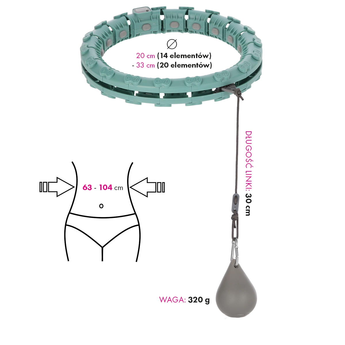 Bøjlen samles af op til 20 klik-segmenter og tilpasses en talje på 63–104 cm. Den bliver siddende og glider ikke over hofterne.