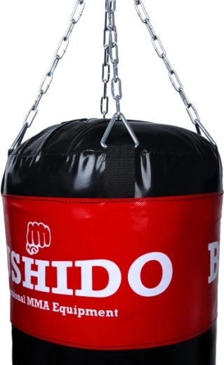 Der medfølger et komplet ophængssystem med svejste kæder (ca. 45 cm) og et drejeligt ophængsøje, der forhindrer vridning. Ideel ophængning kræver en lofthøjde på omkring 245 cm. Sort-rødt design med BUSHIDO-logo passer perfekt i ethvert træningsmiljø.