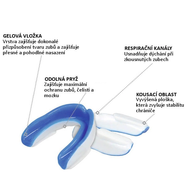 Universel tandbeskytter til kontaktsport med to-lags konstruktion for maksimal sikkerhed og komfort. Det indre gel-lag sikrer behagelig pasform, mens det ydre hærdede gummi med luftkanaler for nem vejrtrækning og stabiliseringsflader holder beskytteren sikkert på plads ved sammenbid.