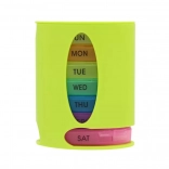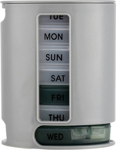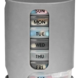 Ugentlig pilleorganizer gør planlægning og regelmæssigt indtag af medicin lettere. Syv separate beholdere er placeret i et stativ; hver boks er mærket med ugedag (EN) og opdelt i 4 rum – morgen, middag, aften, nat. Det er nok at trække beholderen ud nedefra, tage dosis og sætte den tilbage ovenpå – systemet er hurtigt, overskueligt og hygiejnisk.