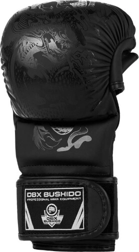 MMA-handsker DBX Bushido Black Dragon er designet til intensiv træning og sparring. Forstærket syntetisk læder med øget elasticitet og fyld af special PUR-skum absorberer stød effektivt og forlænger handskernes levetid. Den åbne inderside forbedrer luftcirkulationen og giver et fast greb ved grappling.