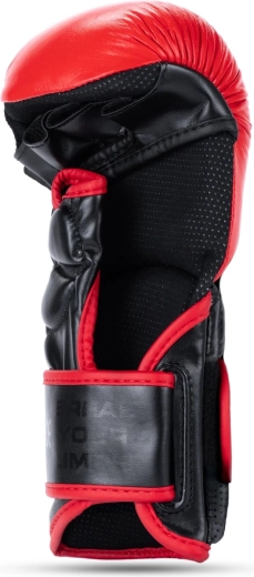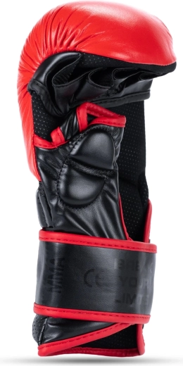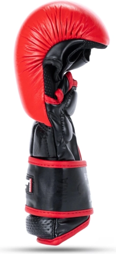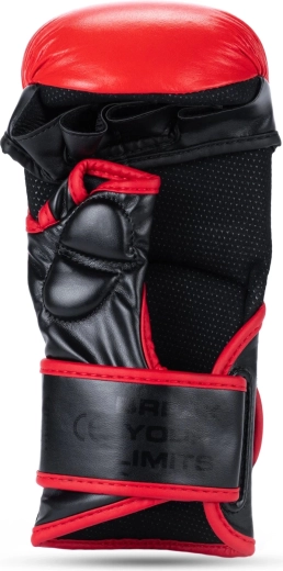 Slagfladen er lavet af kvalitets naturligt koskind for høj holdbarhed, manchet af innovativ forstærket syntetisk læder for fast fiksering. En gennemtænkt fordybning ved velcroen forhindrer utilsigtet fastgørelse og åbning under grappling. Indersiden af handsken har en glat foring for komfort uden skrammer.