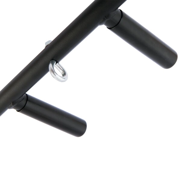 Den massive stålramme med pulverlakeret overflade modstår slitage, og gummihåndtagene giver et sikkert og komfortabelt greb. Det praktiske centrale øje udvider anvendelsen af stangen – hæng for eksempel en boksebold, modstandsbånd eller TRX-stropper på det.