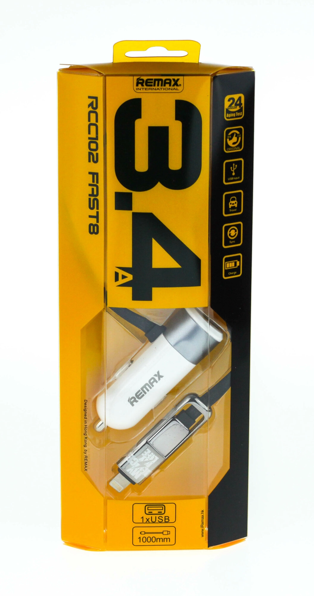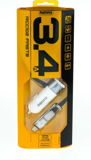 Den kompakte biloplader Remax til cigarettænderstikket tilbyder hurtig opladning med en strøm på 3,4 A og et integreret kabel med to stik: Lightning og micro USB. Ideel til bekvem opladning af telefon eller tablet under kørslen.