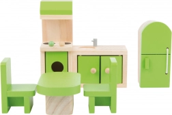 Dette detaljerede køkkensæt til dukkehuse tilbyder alt, hvad små kokke behøver – vask, komfur, køleskab, bord og to stole i en behagelig kombination af naturtræ og friske grønne accenter. Takket være massivt træ er møblerne stabile og klar til daglig leg.