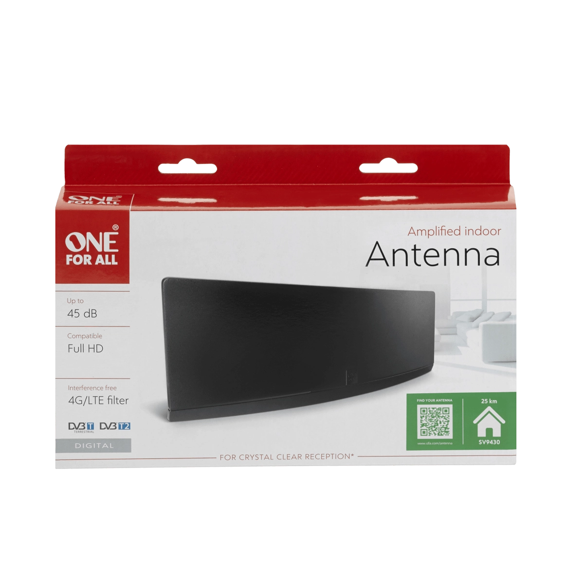 Den stilfulde og kompakte antenne ONE FOR ALL SV9430 er designet til stabil modtagelse af digitalt tv-signal i Full HD samt radio DAB/DAB+. En integreret forstærker op til 45 dB og avancerede filtre til støjreduktion sørger for skarpt billede og ren lyd uden forstyrrelser fra mobilnet.