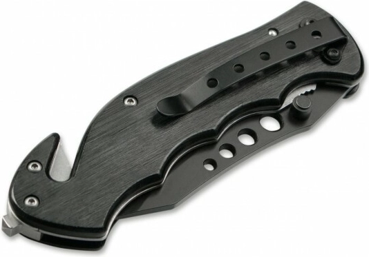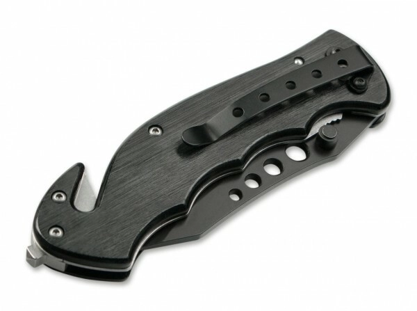 Sikkerhed og funktionalitet sikres af Linerlock-låsen og det robuste skæfte i sort anodiseret aluminium med enhedens emblem. Den integrerede glasknuser og sele-/sikkerhedsbælteskærer er uvurderlige i nødsituationer, og lommeclipsen giver komfortabel bæring og øjeblikkelig adgang.