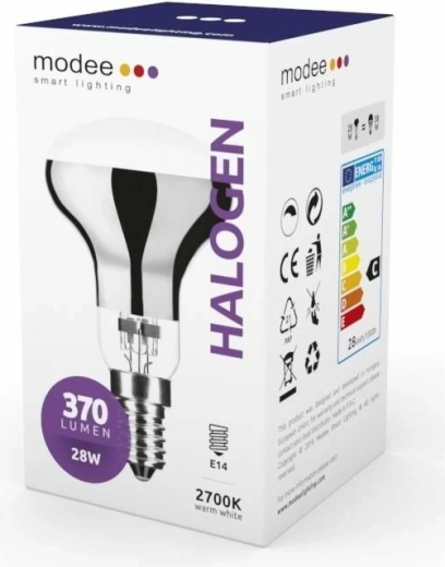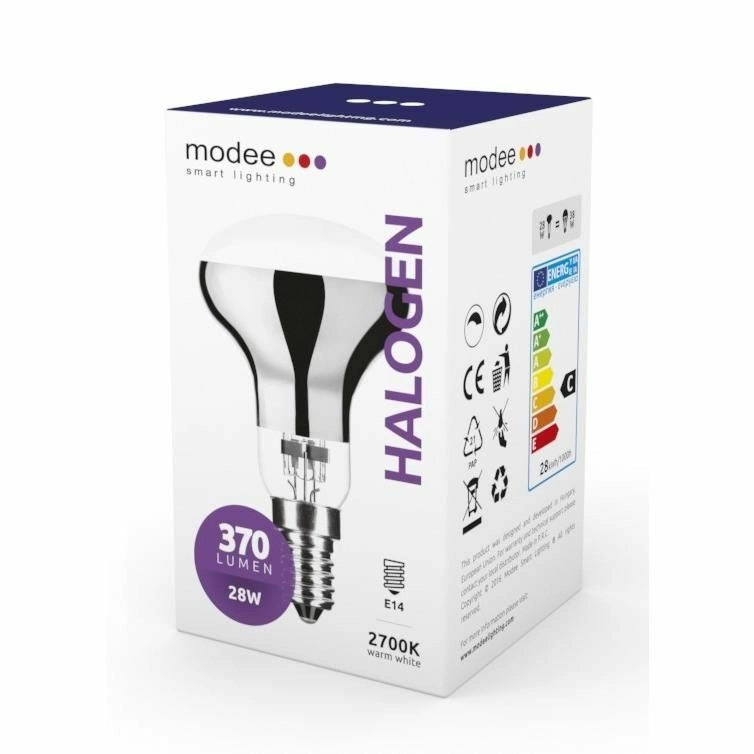 Energibesparende halogenpære Modee med E14-fatning og effekt på 28 W leverer varmt hvidt lys 2700 K, øjeblikkelig fuld lysstyrke, dæmpbar lysstrøm og bred lysvinkel på 120°. Takket være den særlige konstruktion med IR-reflekterende belægning opnås højere effektivitet, og pæren er velegnet til enhver lampe med E14-fatning.