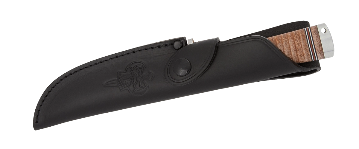 Den dobbelte indvendige indsats øger sikkerheden og beskytter både knivens skær og selve etuiet mod gennemskæring. Den praktiske konstruktion muliggør behagelig fastgørelse i bæltet og stabil fastholdelse af kniven.