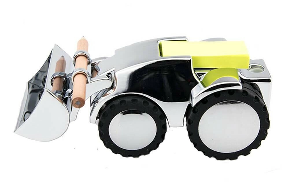 Stilfuld bordorganisator i form af en gravemaskine, der kombinerer sjovt design og smart funktionalitet. Indeholder en magnet til papirklips, blyantspidser, holder til pen/blyant inklusive 1 blyant og en dispenser til selvklæbende noter (80 ark) – alt samlet ét sted for et ryddeligt skrivebord.
