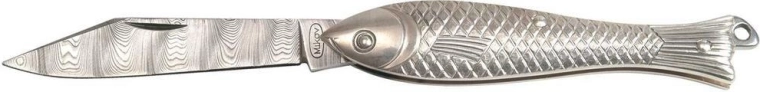 Den ikoniske Fisk fra Mikov i en eksklusiv sølvudgave forener tjekkisk tradition med førsteklasses materialer. Damaskusklingen i sammensætningen PMC27 (12C27 + RWL34) sikrer fremragende skarphed, holdbarhed og en unik struktur. Det massive sølvhåndtag 925/1000 er punslet og fremstår ekstraordinært elegant.