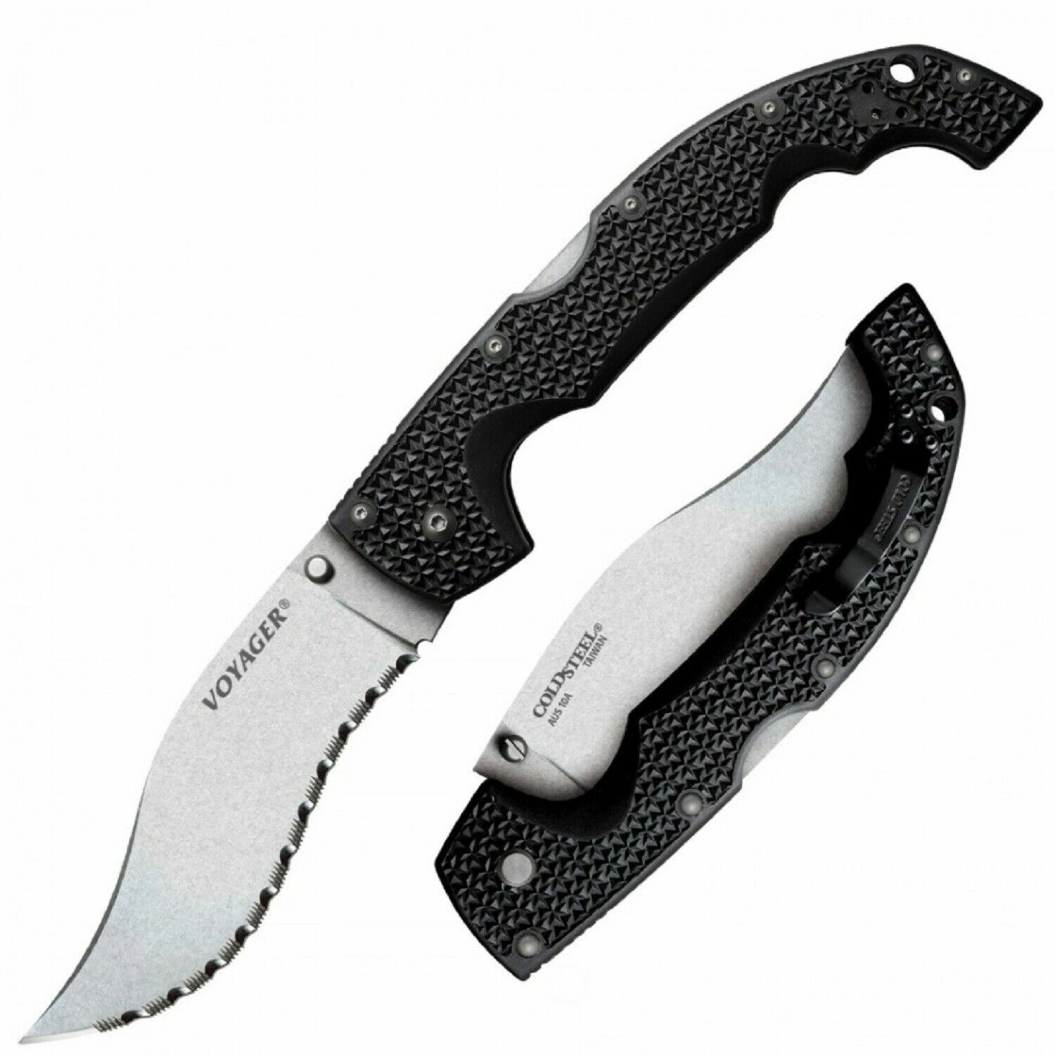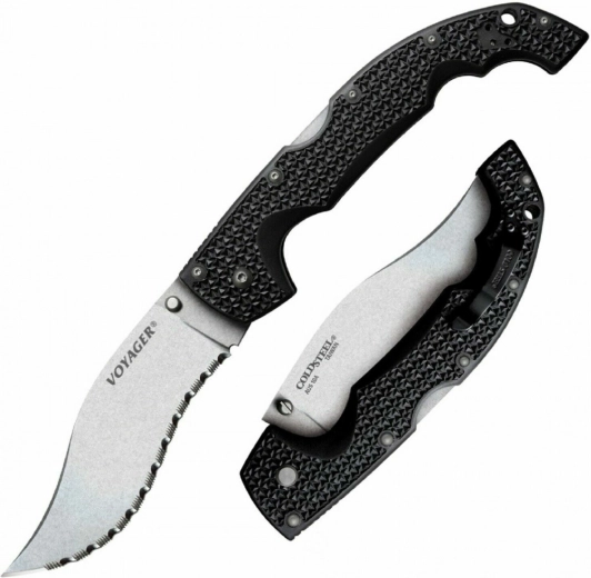 Cold Steel Extra Large Voyager Vaquero Serrated er en robust, men let foldekniv med den aggressive Vaquero-klingeform, som udmærker sig ved både skæring og hakning. Takket være det savtakkede skær og det slidstærke AUS10A-stål håndterer den hårdere materialer og bevarer sin skarphed i lang tid. Stonewash-overfladen mindsker synligheden af ridser og øger modstandsdygtigheden ved daglig brug.