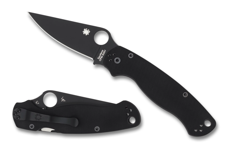 Den professionelle lommekniv Spyderco Para Military 2 i helt sort udførelse tilbyder fremragende skæreevne, en pålidelig Compression Lock og en slidstærk klinge i CPM S30V med DLC-belægning. Ideel til EDC, taktisk brug, jagt og overlevelse, med sikkert greb takket være teksturerede G10-skæfter.