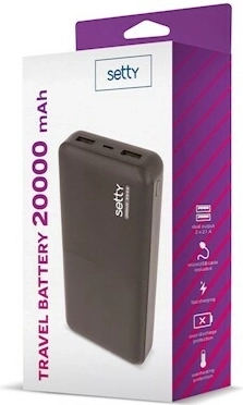 Kompakt og pålidelig SETTY powerbank 20.000 mAh i elegant sort giver strøm nok på farten. Oplad smartphones, tablets og andre enheder når som helst og hvor som helst takket være to USB-udgange og en praktisk micro-USB-indgang. Stabil 5V-udgang med strøm op til 2,4 A sørger for hurtig og sikker opladning.