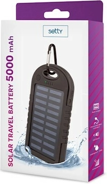 Kompakt og robust Setty solcelledrevet powerbank med en kapacitet på 5000 mAh oplader pålideligt din telefon, tablet eller GPS selv langt fra civilisationen. Oplad via solpanel eller USB, nyd to USB-udgange, IP66-vandtæthed og integreret LED-lys – den ideelle rejse- og friluftsmakker.