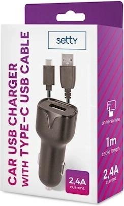 Praktisk og kompakt SETTY billader med effekt op til 2,4 A oplader pålideligt din telefon, GPS eller andre enheder under kørslen. Den har USB‑C‑udgang og leveres med et USB‑C‑kabel på 1 m. Understøtter spænding 12–24 V, så den er egnet til både person- og lastbiler.