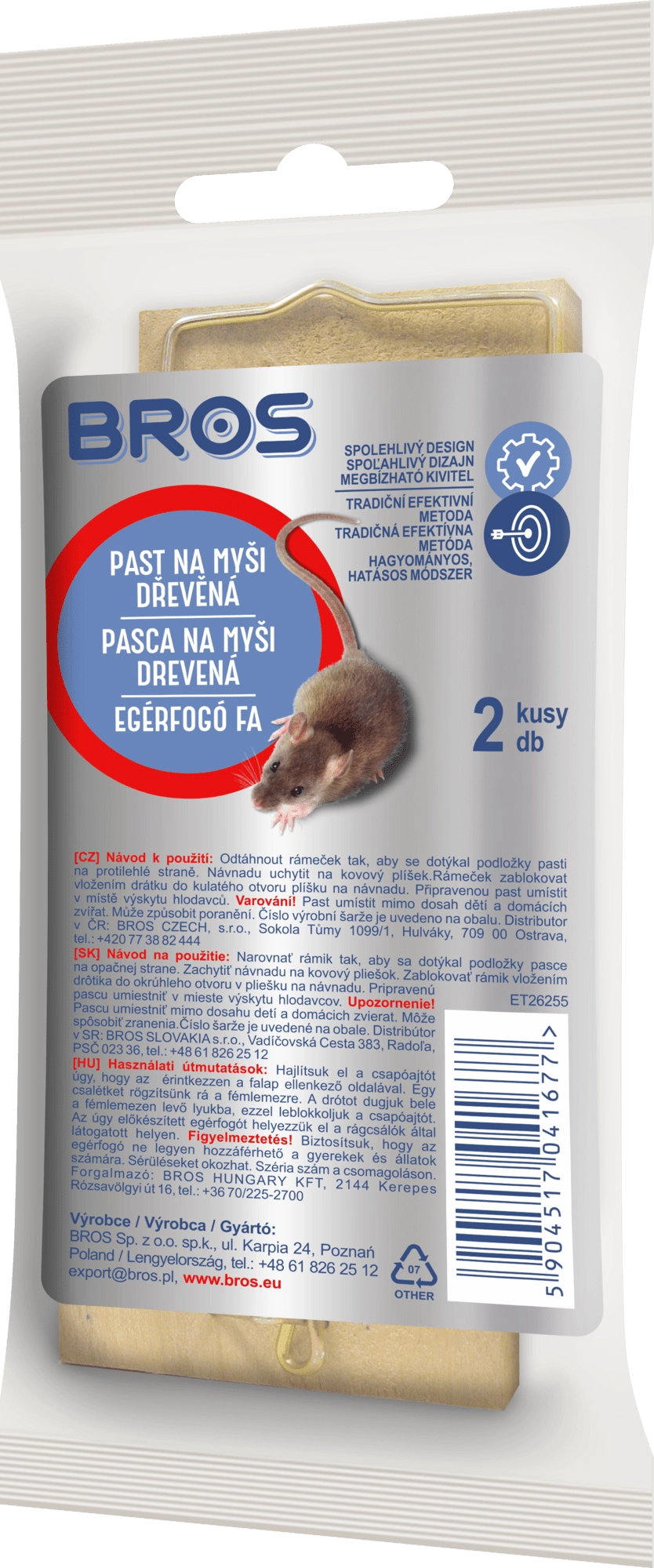 Træfællen til mus BROS er en klassisk og gennemprøvet løsning til hurtig fjernelse af uønskede gnavere. Fremstillet af bøgetræ med højere modstandsdygtighed over for fugt, giver den stabilitet, lang levetid og pålidelig virkning. Takket være den enkle konstruktion kan den nemt sættes op derhjemme, i garage, kælder eller i sommerhus.