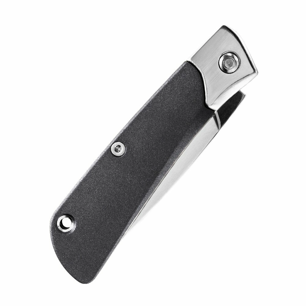 Det holdbare eloxerede aluminiumskaft i grå er let, behageligt i hånden og udstyret med et hul til snor. Kniven har ingen lommeclips, så den forbliver diskret og kompakt i lommen eller tasken. Et fremragende valg for minimalister og alle, der sætter pris på enkelhed og funktionalitet.