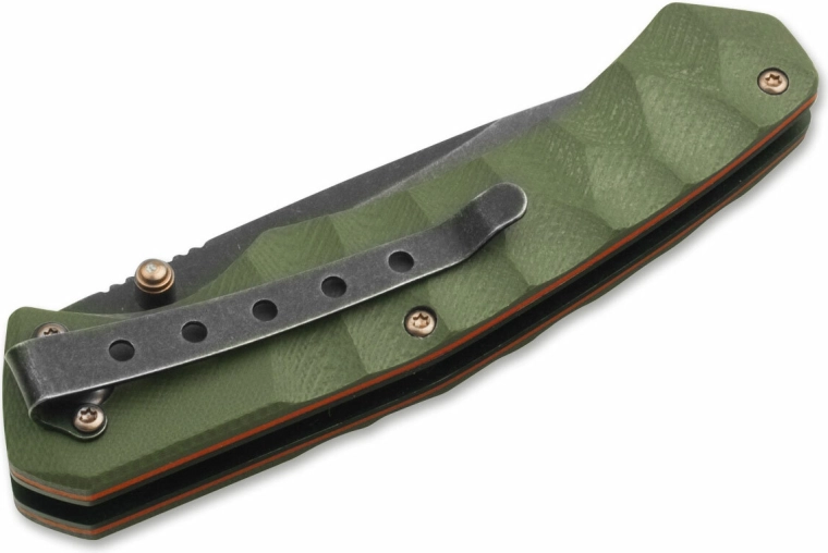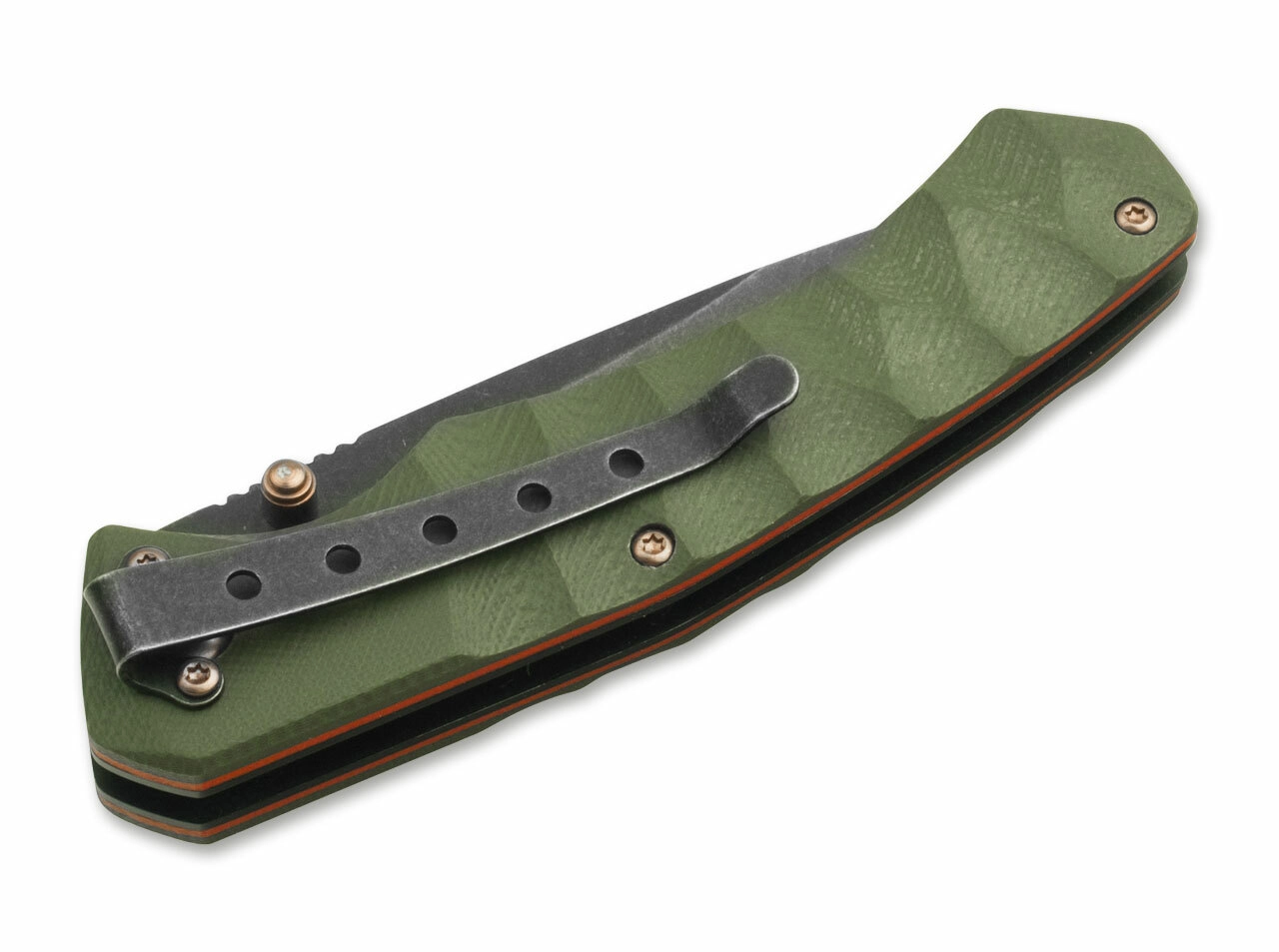 Takket være dobbeltsidede tommelknopper kan kniven åbnes nemt med én hånd, og den pålidelige Linerlock sørger for sikkerheden. Det teksturerede G10-skæfte i olivengrøn farve giver en stabil og komfortabelt greb, selv under mere krævende forhold. Klipsen muliggør diskret bæring i lommen eller på bæltet.