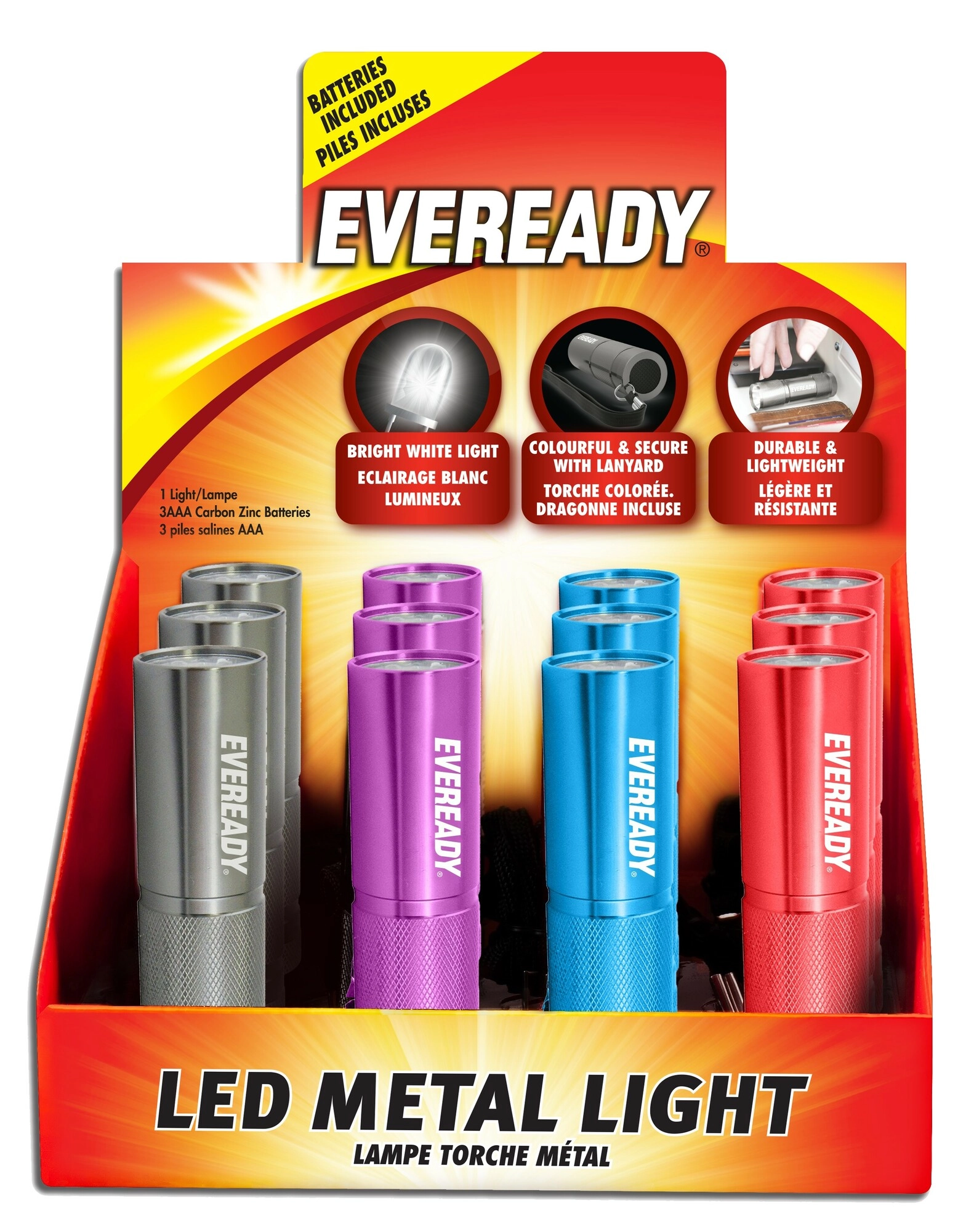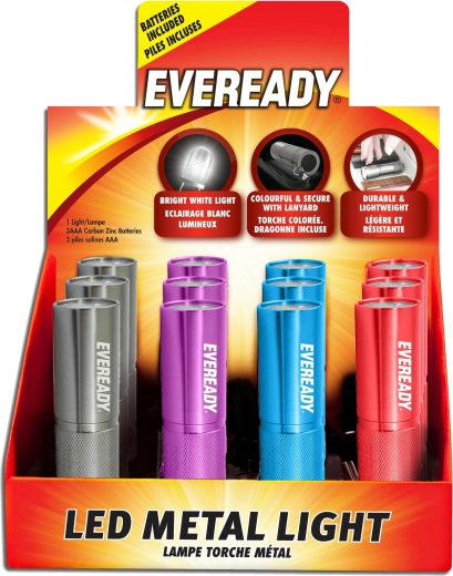 Den kompakte lommelygte ENERGIZER Eveready Metal er ideel til nøgleringen og lommen. Den tilbyder et metalhus for øget holdbarhed, strømforsyning med 3× AAA for nem udskiftning og sælges stk.vis i forskellige farver (sort, purpur, turkis, rød).