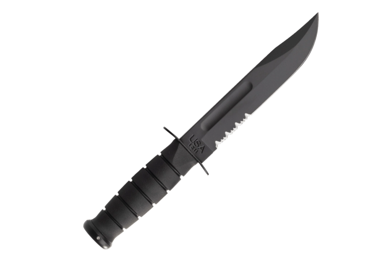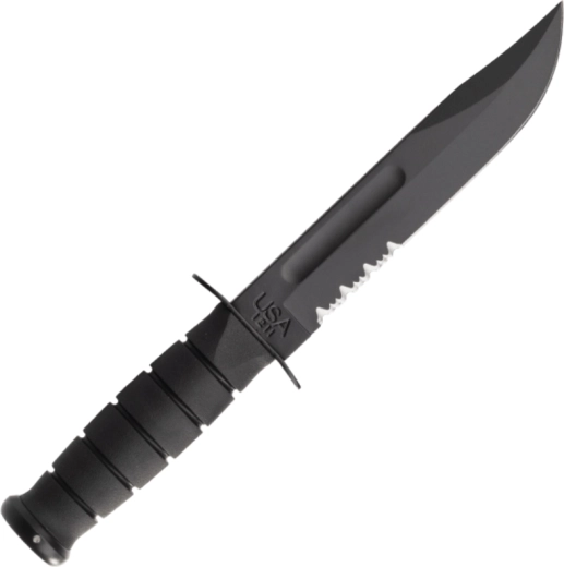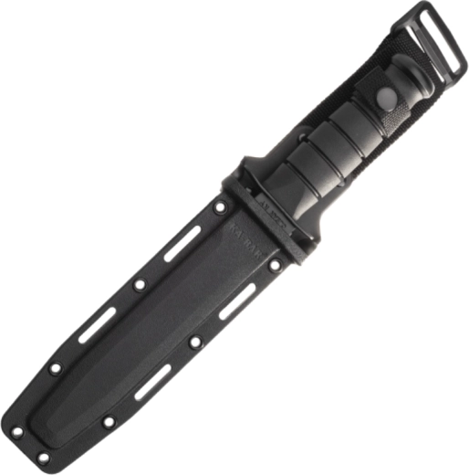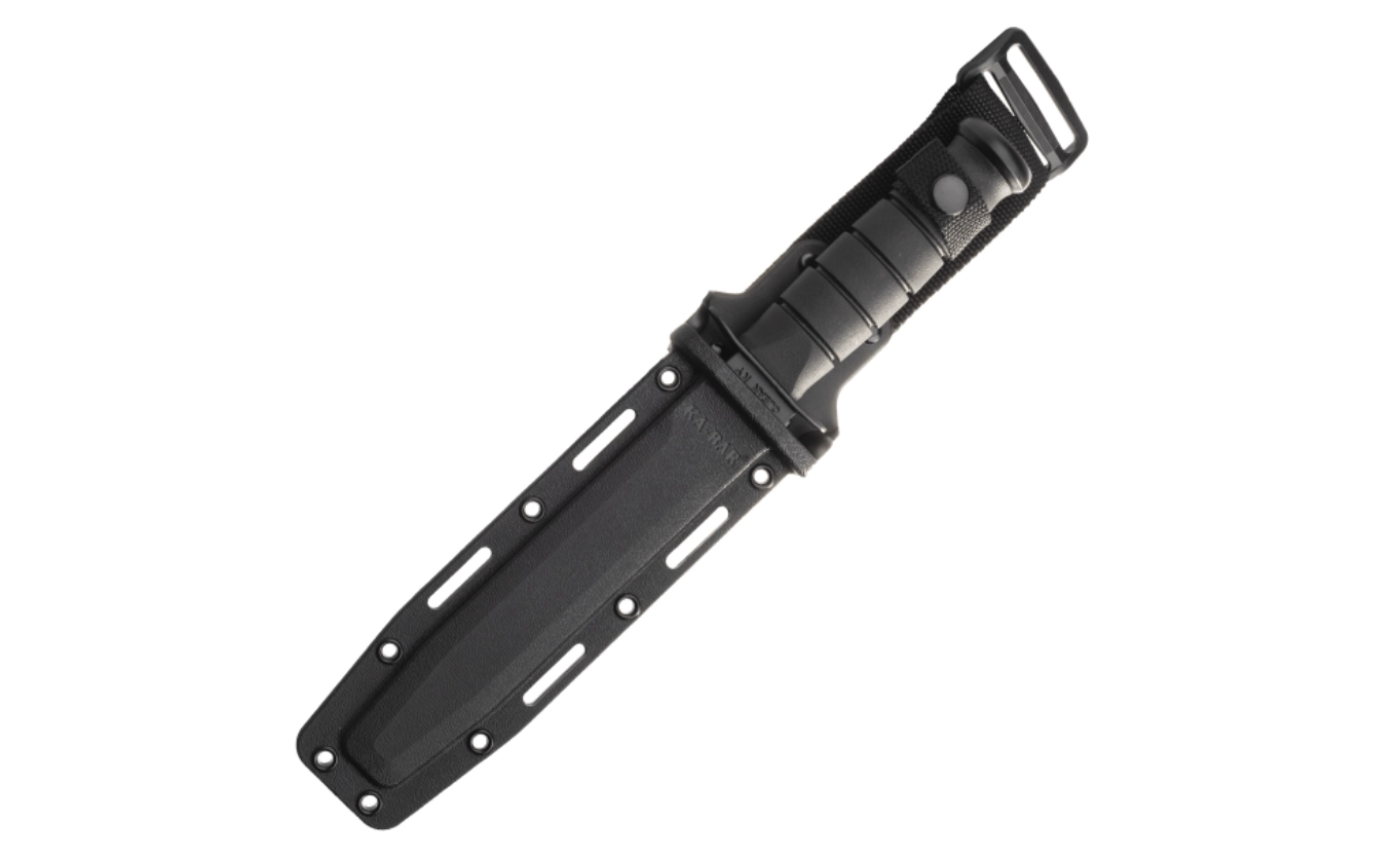 Den taktiske kniv KA-BAR, inspireret af de legendariske U.S.M.C.-modeller, tilbyder en fast klinge på 17,9 cm i stål 1095 Cro-Van med delvist savtakket æg og sort beskyttelsesbelægning. Det skridsikre skæfte i Kraton sikrer et sikkert greb, og pakken indeholder en robust Kydex-skede.