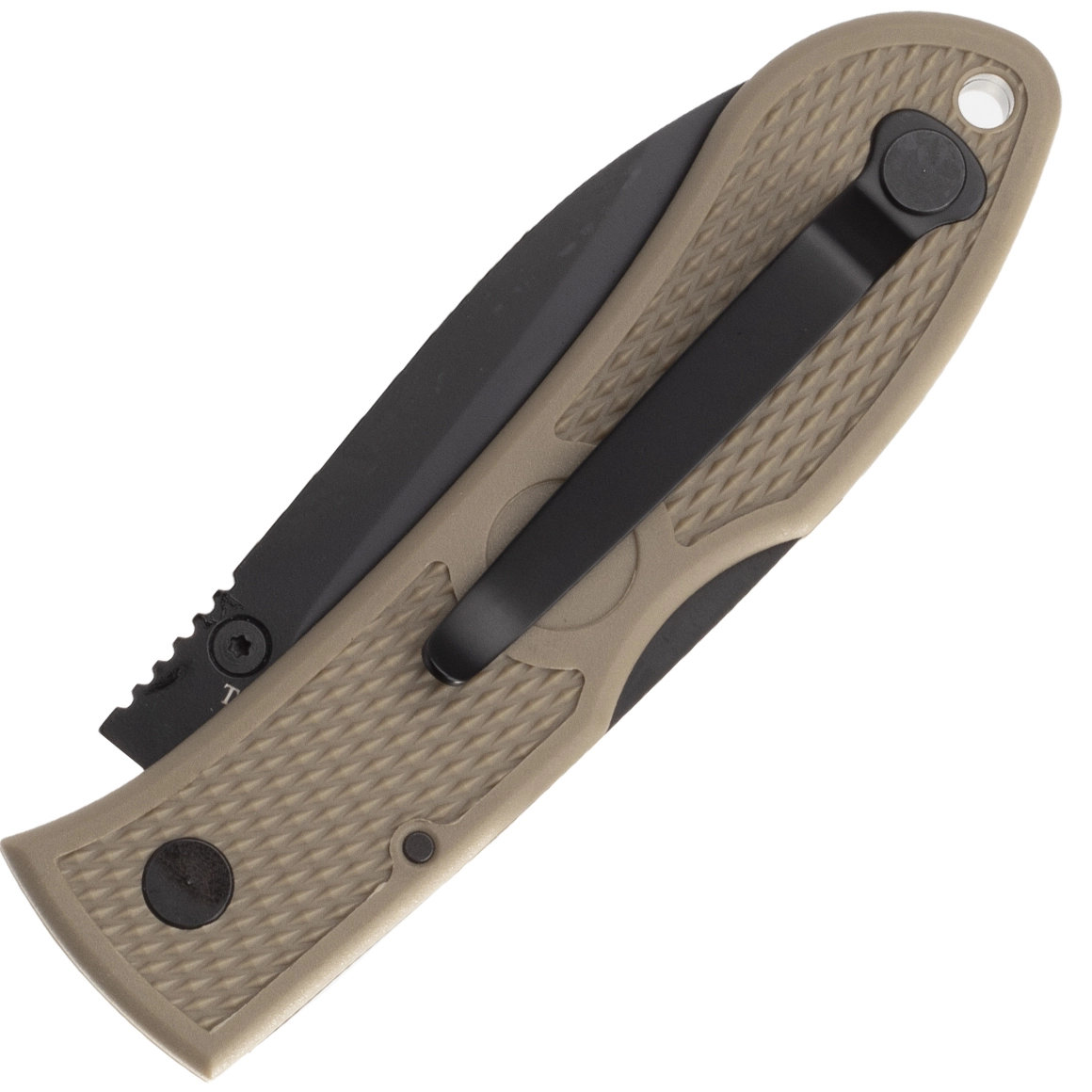 Tekstureret Zytel i farven Coyote Brown sikrer et fast greb, lav vægt og lang levetid. Clippen kan ommonteres, og der er hul til snor.