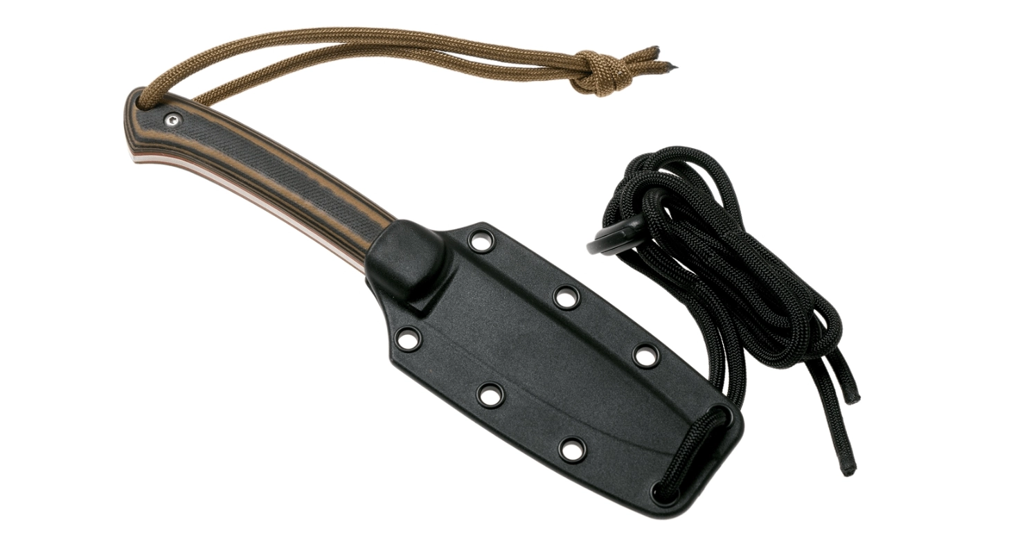 Skæftet i det lagdelte materiale G10 i brun‑sort udførelse ligger fremragende i hånden, er modstandsdygtigt over for fugt og giver et sikkert greb. Huller til snor muliggør fastgørelse af kniven eller gør det lettere at trække den. I pakken medfølger en let plastskede, som du kan bære i bæltet eller hænge om halsen – ideelt for hurtig og sikker adgang.
